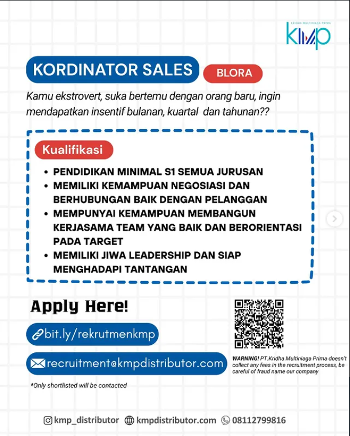 Apakah Anda seorang ekstrovert yang gemar bertemu orang baru dan memiliki jiwa kepemimpinan yang kuat? PT Kridha Multiniaga Prima (KMP Distributor) saat ini membuka kesempatan emas bagi talenta-talenta profesional di wilayah Blora untuk bergabung dalam tim hebat mereka sebagai Koordinator Sales. Posisi ini sangat ideal bagi Anda lulusan Sarjana (S1) dari segala jurusan yang menyukai tantangan dan memiliki orientasi tinggi pada pencapaian target. Perusahaan menawarkan paket remunerasi yang sangat menarik, tidak hanya gaji, tetapi juga skema insentif yang lengkap mulai dari insentif bulanan, kuartal, hingga tahunan bagi mereka yang berprestasi. Jika Anda merasa memiliki kemampuan negosiasi yang ulung dan siap memimpin tim penjualan menuju kesuksesan, segera daftarkan diri Anda sebelum kesempatan ini berlalu.
