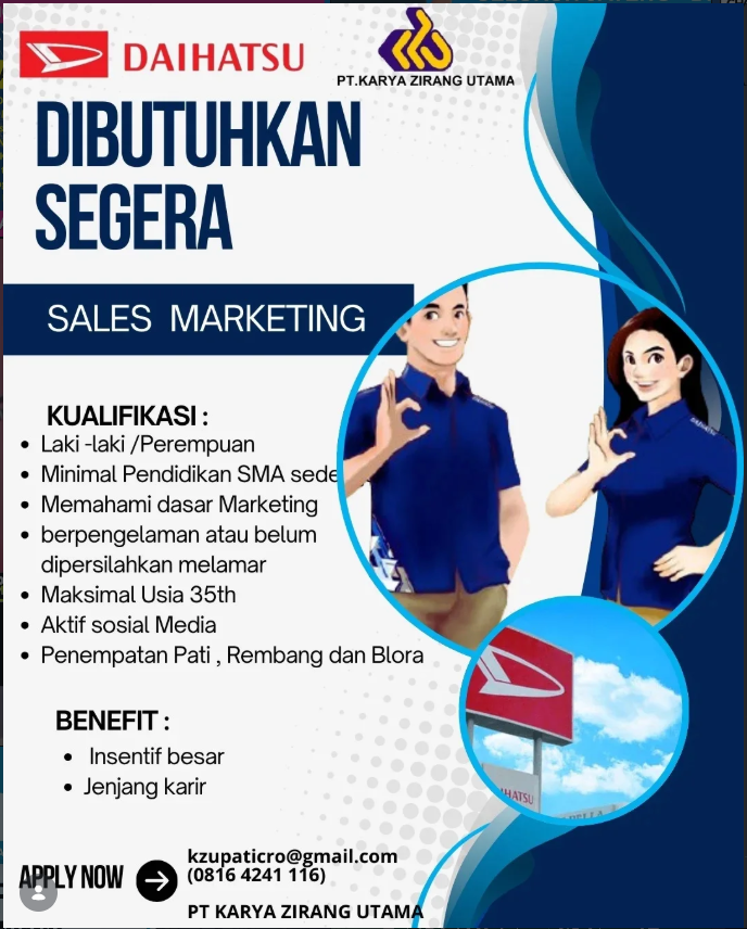 PT Karya Zirang Utama (Daihatsu), sebagai salah satu dealer resmi mobil terkemuka, saat ini sedang membutuhkan tenaga profesional untuk memperkuat tim pemasarannya. Perusahaan membuka lowongan kerja untuk posisi Sales Marketing dengan cakupan wilayah penempatan yang luas, meliputi Pati, Rembang, dan Blora. Peluang ini sangat inklusif karena terbuka bagi kandidat berpengalaman maupun bagi Anda yang baru lulus (fresh graduate) dan belum memiliki pengalaman kerja, asalkan memiliki pemahaman dasar tentang dunia pemasaran. Kriteria utama yang dicari adalah individu yang aktif di media sosial, komunikatif, dan memiliki semangat tinggi untuk mencapai target. Jika Anda berusia maksimal 35 tahun dan ingin berkarier di industri otomotif dengan potensi insentif yang besar serta jenjang karier yang jelas, segera kirimkan lamaran Anda.