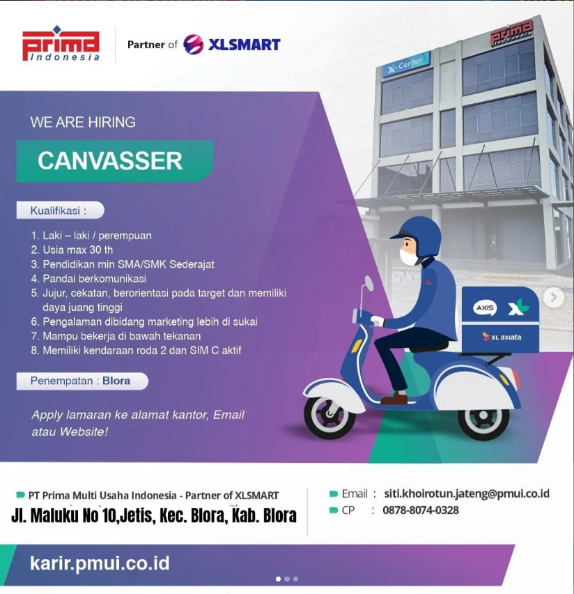 Info Loker Canvasser Blora terbaru di PT Prima Multi Usaha Indonesia (Partner XLSMART). Dibuka 3 posisi sales. Syarat SMA/SMK, punya…